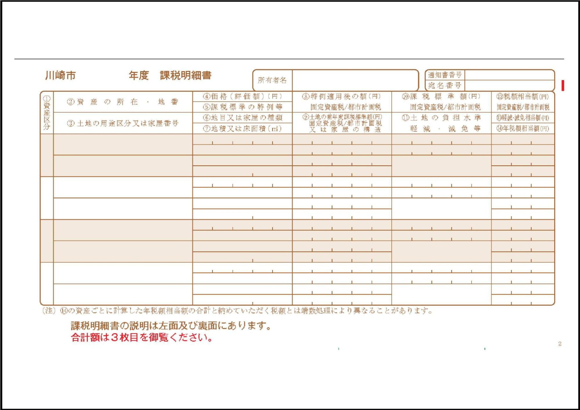 - 面積→登記事項証明書(もしくは登記簿謄本)と照らし合わせながら、登記面積と課税明細書に記載されている面積が一致しているかを確認